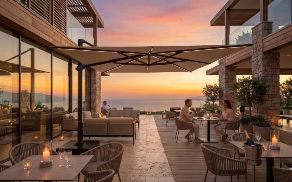 The Nero LED is designed for those who want to enjoy their terrace long into the evening, without compromising on style or comfort. Thanks to its secure ground anchoring, the parasol stands exceptionally stable and is perfectly suited for both private gardens and professional hospitality settings.